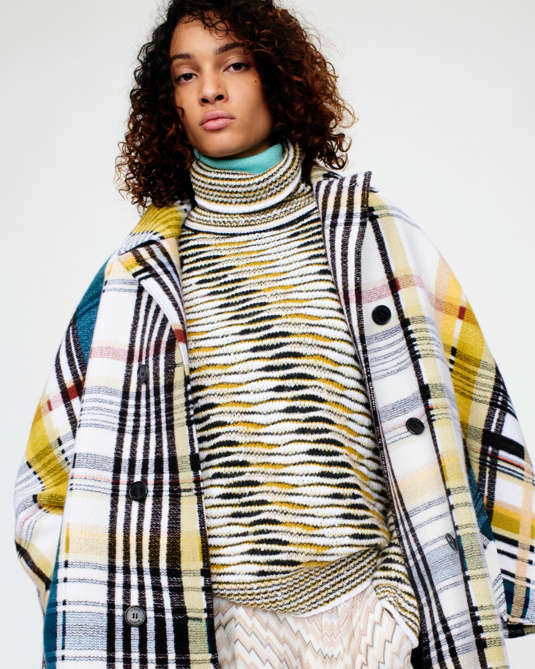 “MISSONI inaugurated and affirmed an unmistakable way of dressing and living: with a colorful “put-together” of zigzag motifs, stripes, waves and slub yarns in a patchwork of geometric and floral jacquard.”